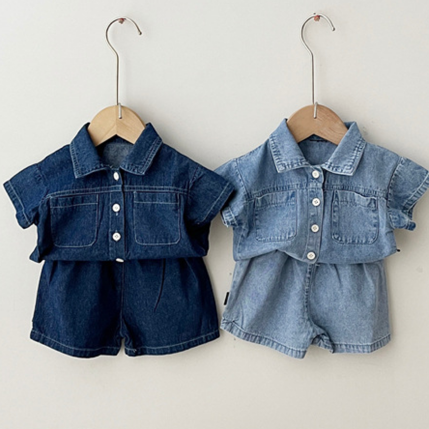 2pcs Baby Boy/Girl Summer Simple Solid Polo Collar T-shirt & Elasticized Shorts Denim Set
