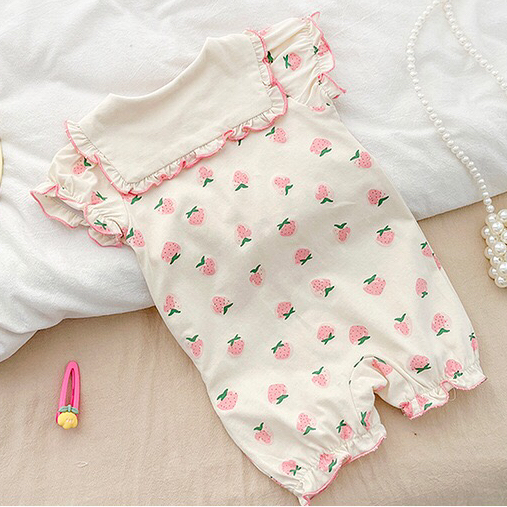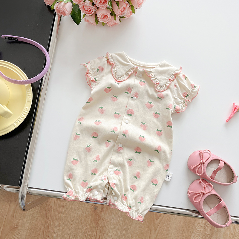 Baby Girl Strawberry Pattern Peter Pan Collar Ruffle Flounce Short Sleeve Romper