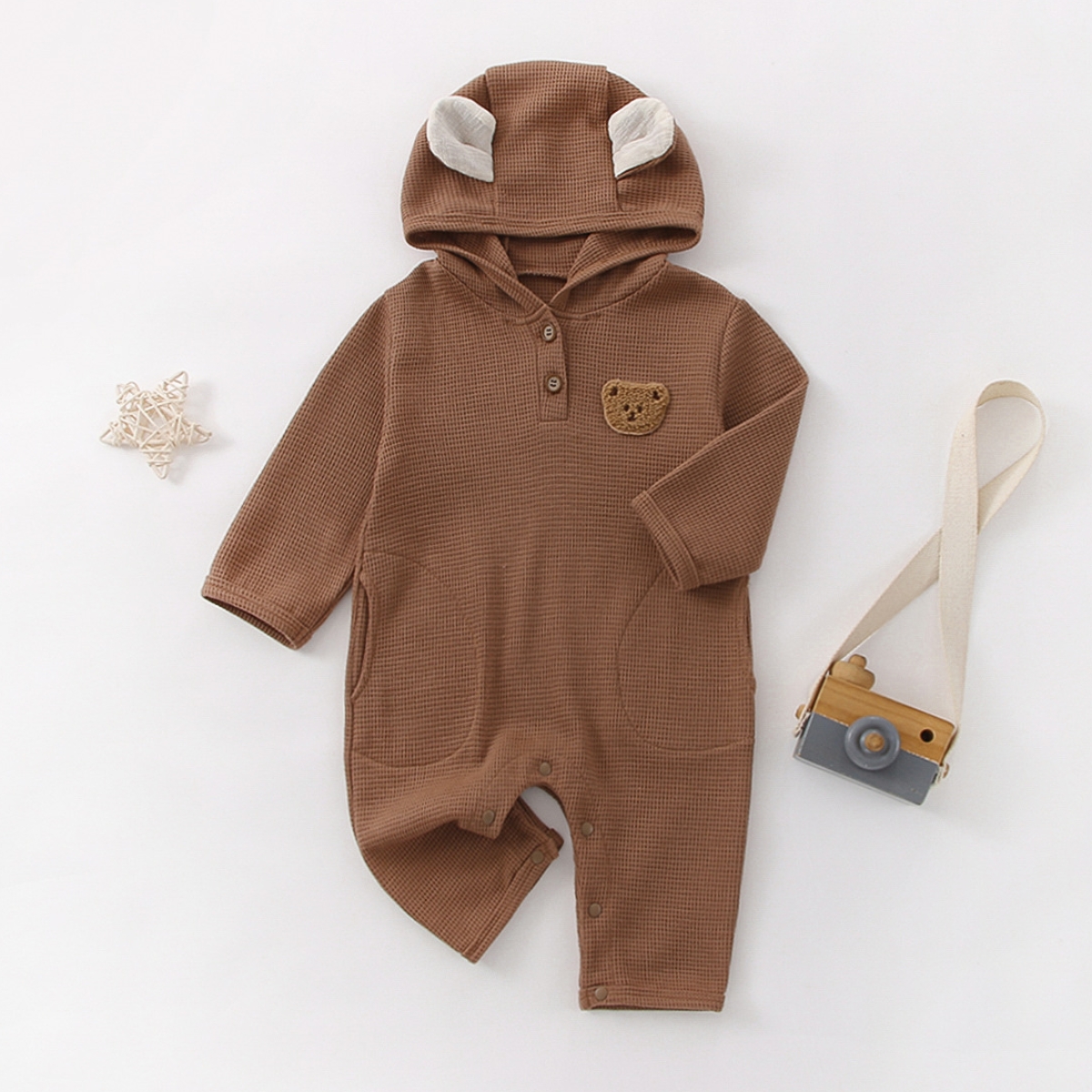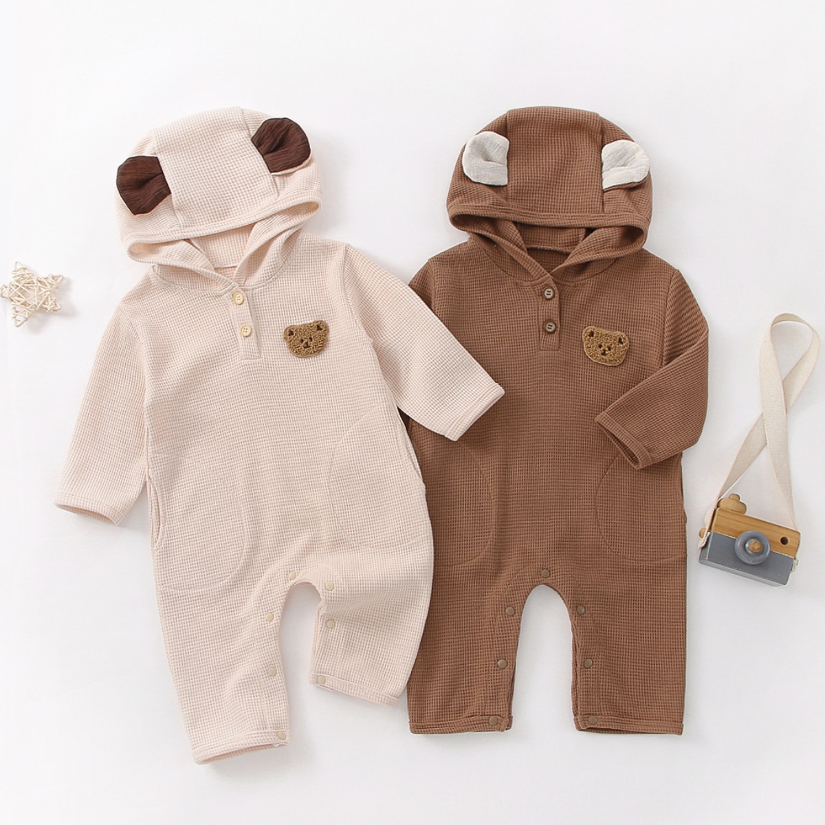 Baby Boy/Girl Waffle Bear Suspender Long Sleeve 3D Ear Hooded Romper