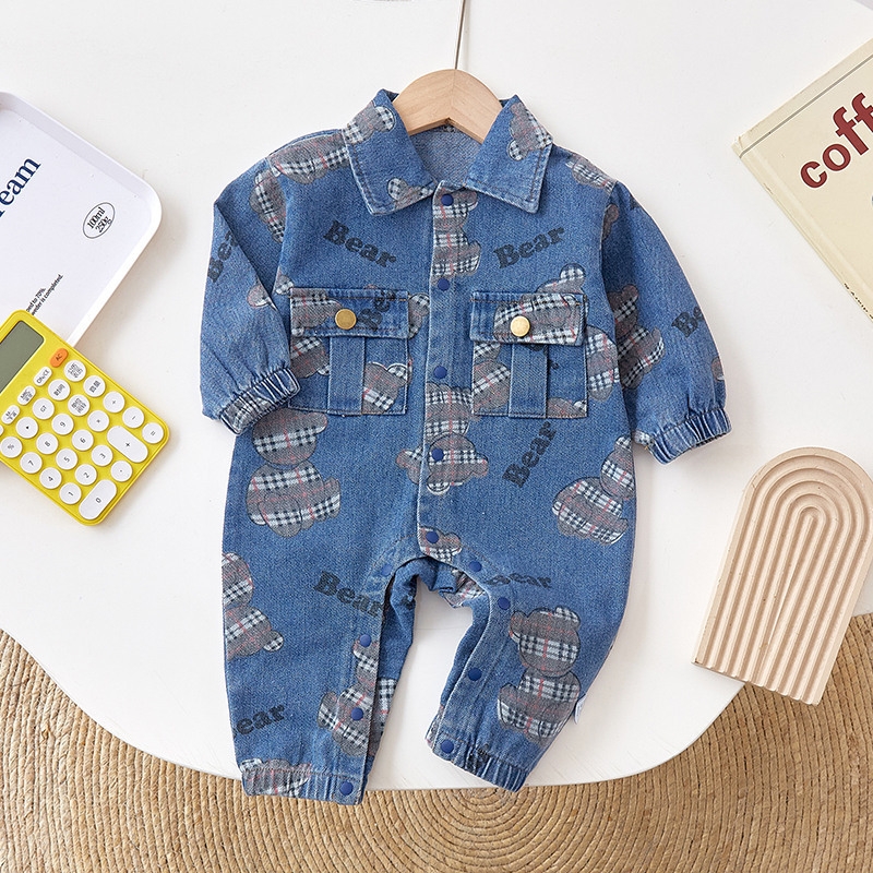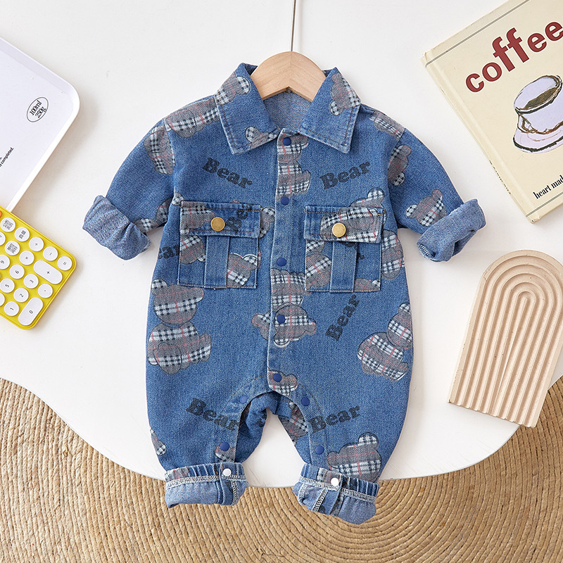 Baby Boy/Girl Allover Bear Letter Print Botton Up Casual Denim Romper