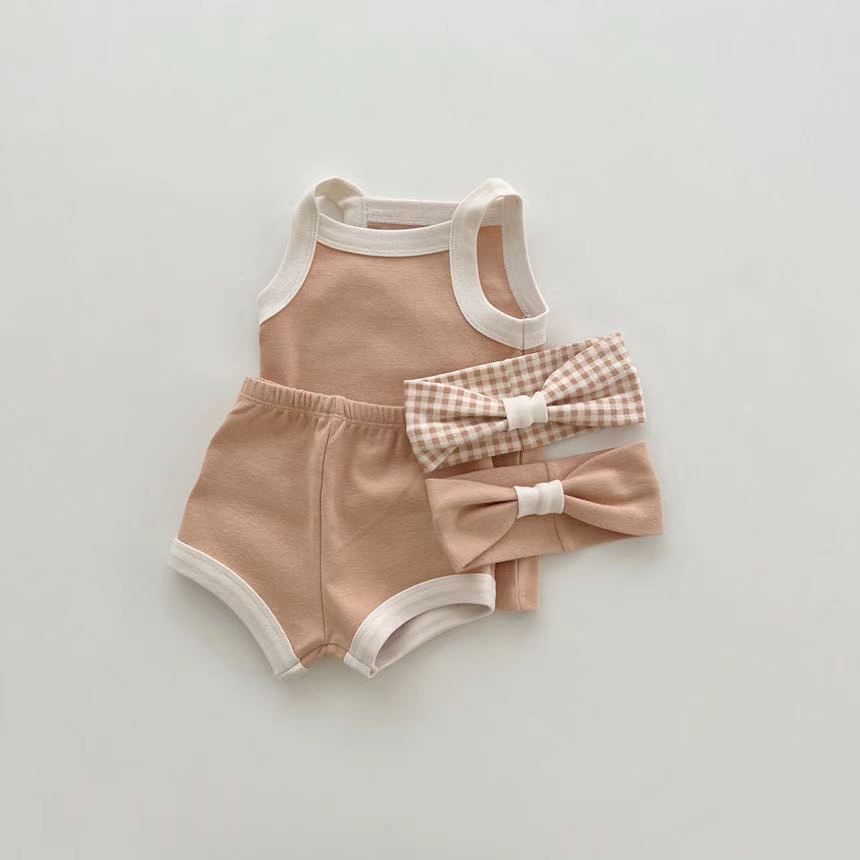 3pcs Baby Girl Simple Block Color Cami Tank Top & Solid Rolled Hem Shorts with a Hairband Set