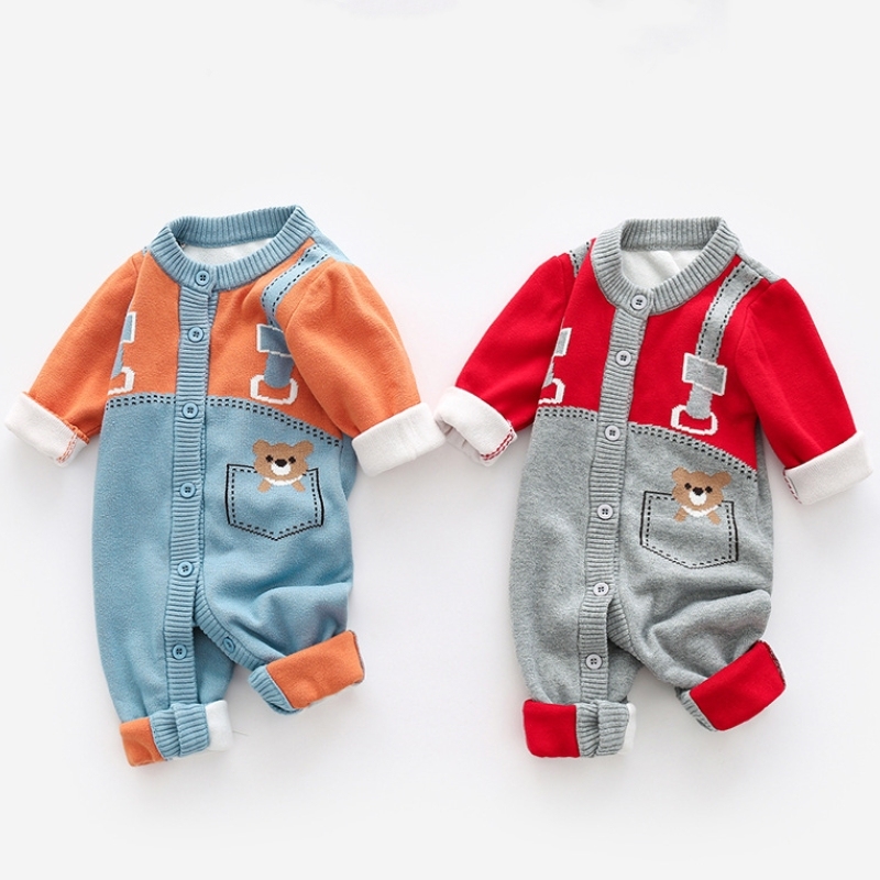 Baby Boy/Girl Bear Pattern Block Color Long Sleeve Knitted Romper
