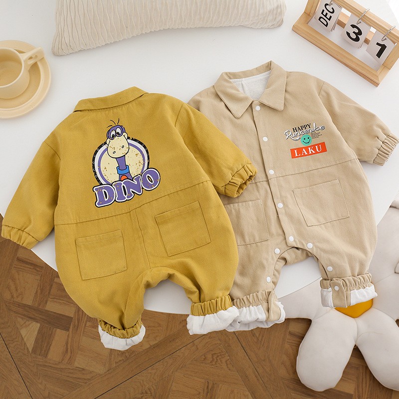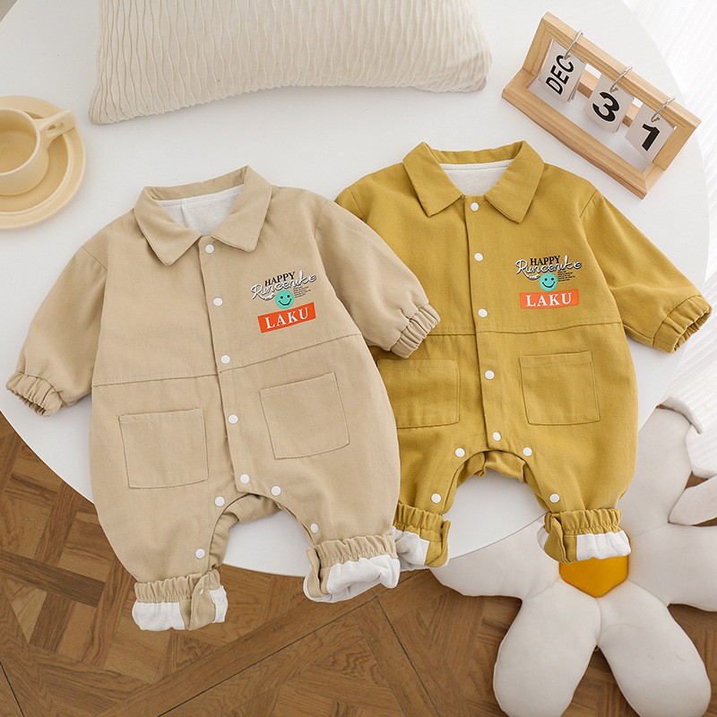Baby Boy/Girl Simple Polo Collar Long Sleeve square Pocket Overalls Romper