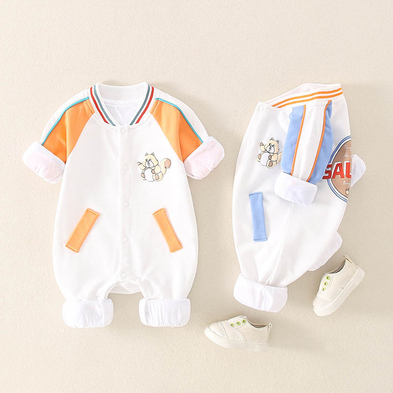 Baby Boy/Girl Embroideried Bear Print Block Color Long Sleeve Ribbed Romper