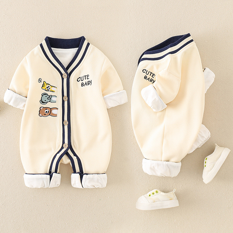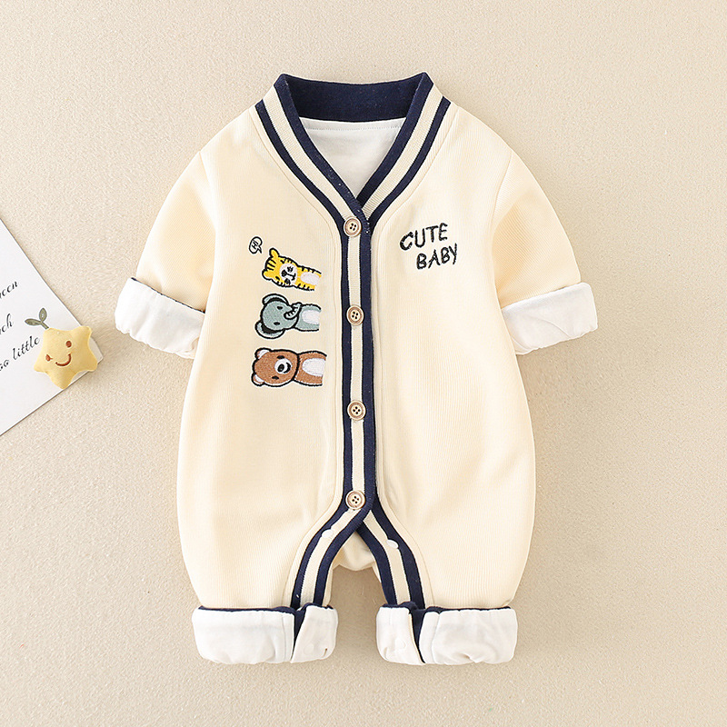 Baby Boy/Girl Embroideried Three Animals and Letter Print Knitted Botton Up Romper