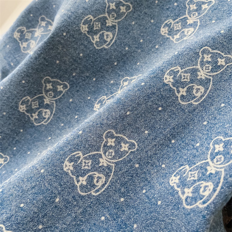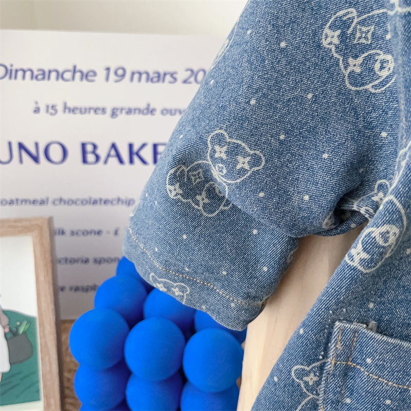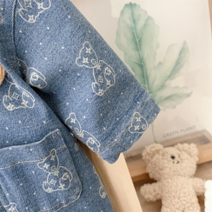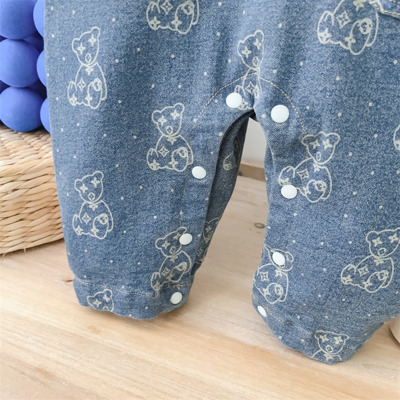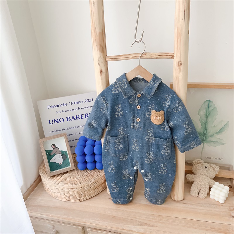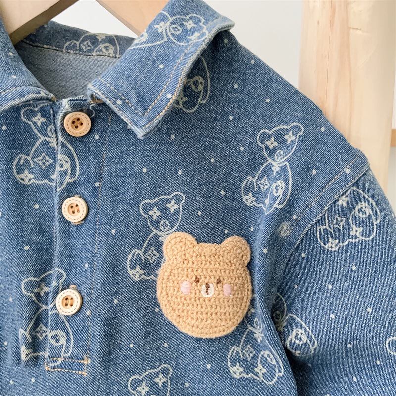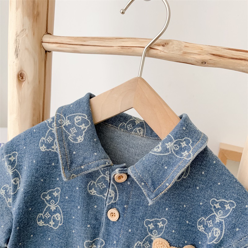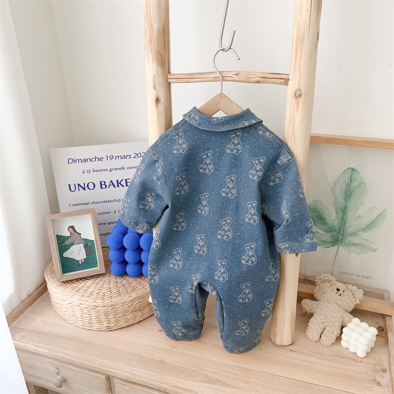 Baby Boy Allover Bear Print and Mini Bear Embroidery Polo Collar Long Sleeve Denim Romper