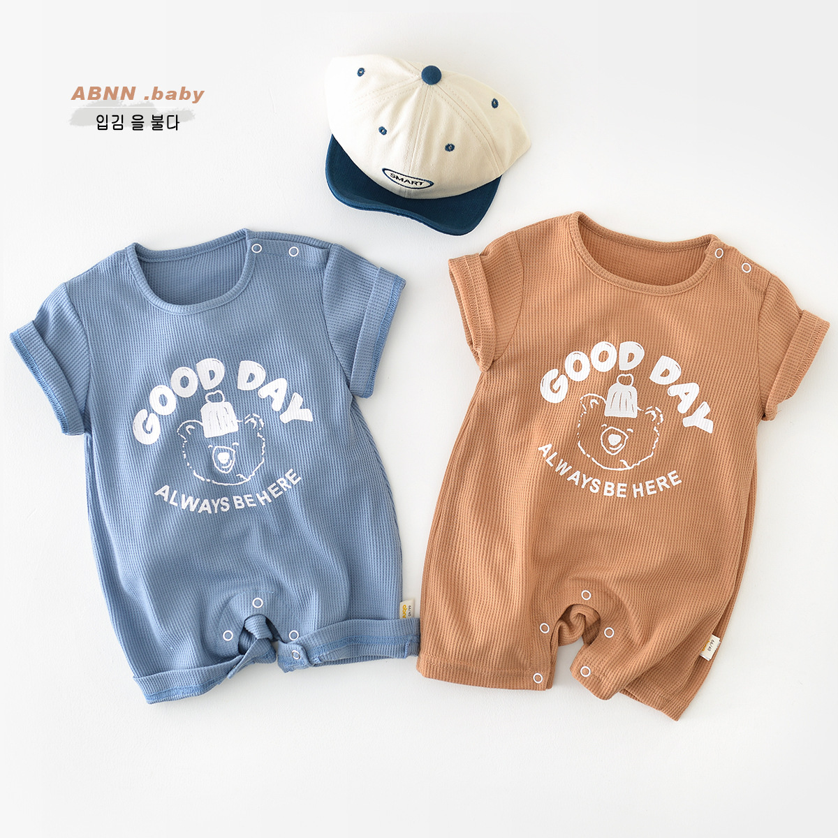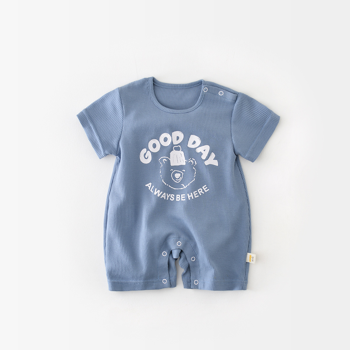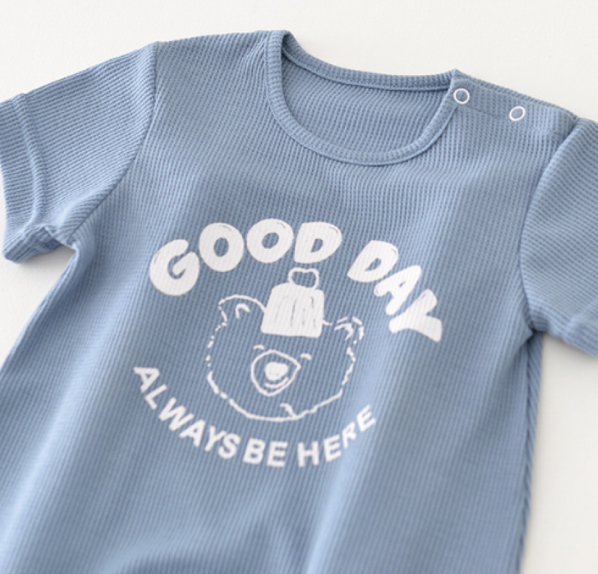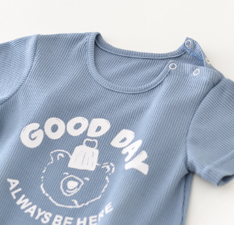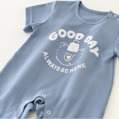 Baby Boy Summer Ribbed Knitted Solid Fashion Print Letter and Bear Short Sleeve Snap Comfortable and Brethable Romper