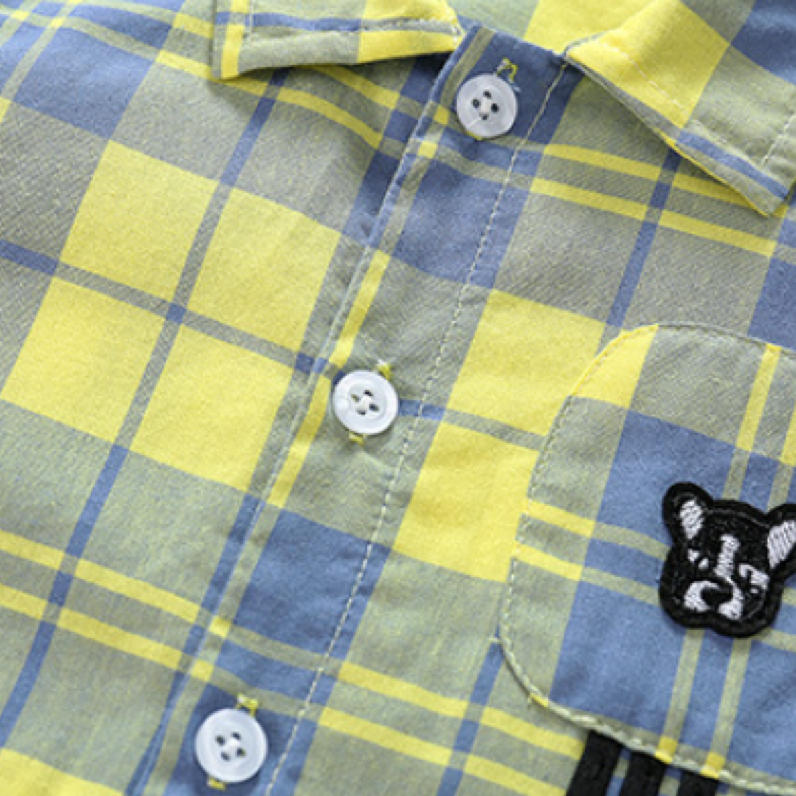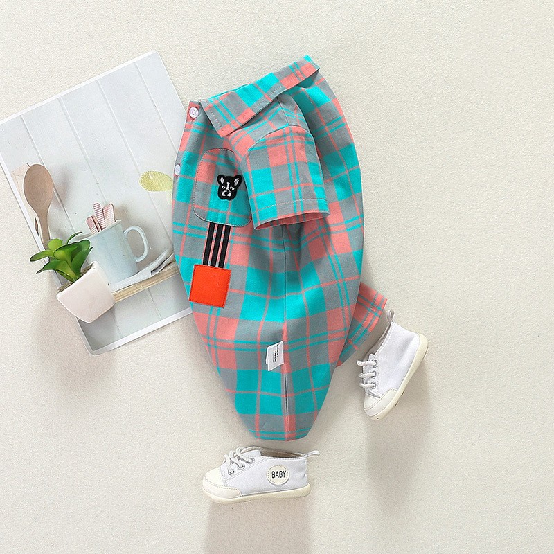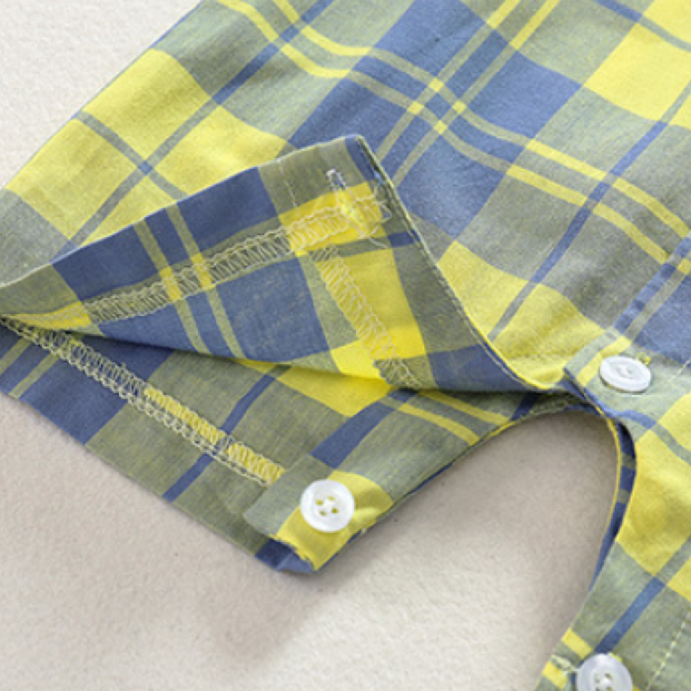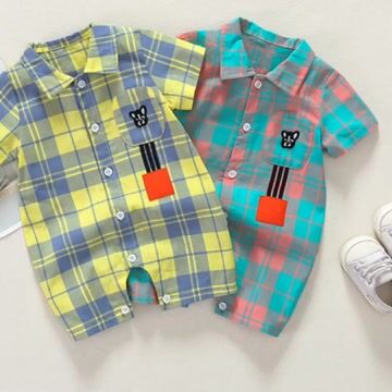 100% Cotton Baby Toddler Boy Embroideried Dog Polo Collar Casual Colorful Gingham Short-sleeve Button Up Romper